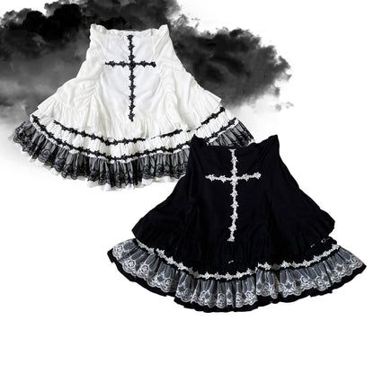 Add an edge to your wardrobe with the Kitten Bullet Cross Contract Skirt. Available in white, pink, and black, this high-waisted skirt features a bold cross pattern, sewn with delicate laces. The lace ruffle trim at the hem gives it a soft, feminine touch. Perfect for adding a dark, chic vibe to any outfit. ✝️