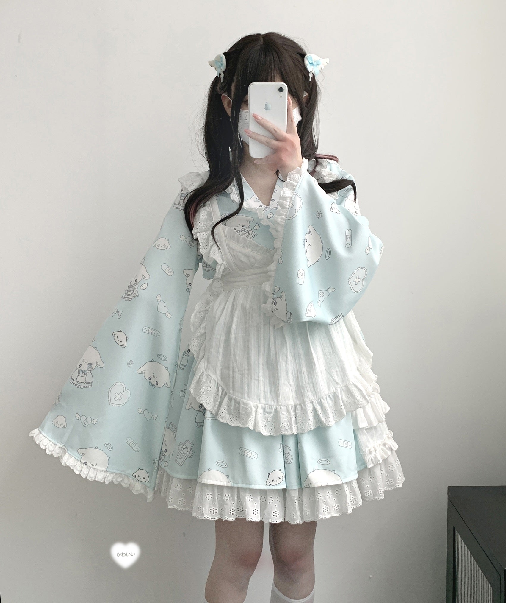 Kitten Bullet Healing Therapy Blue Black White Kimono Apron Skirt Three Piece Set