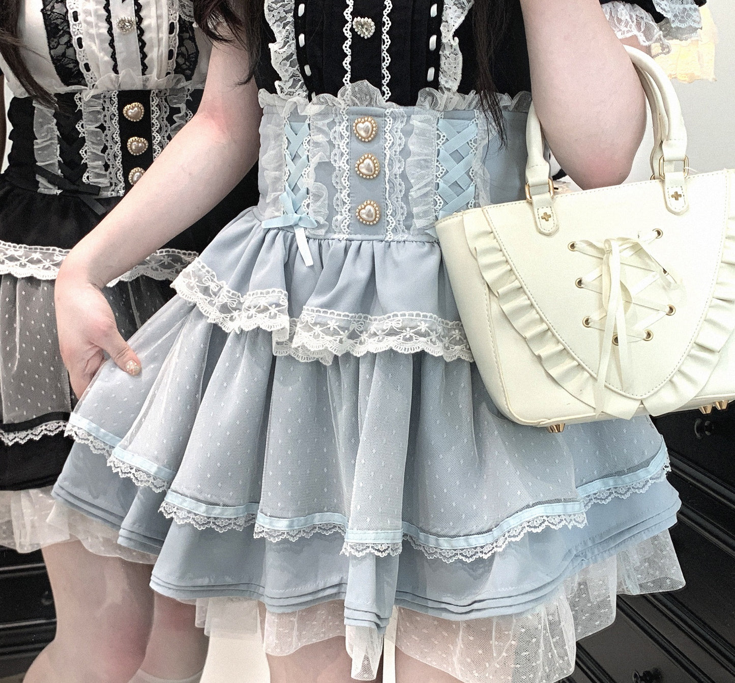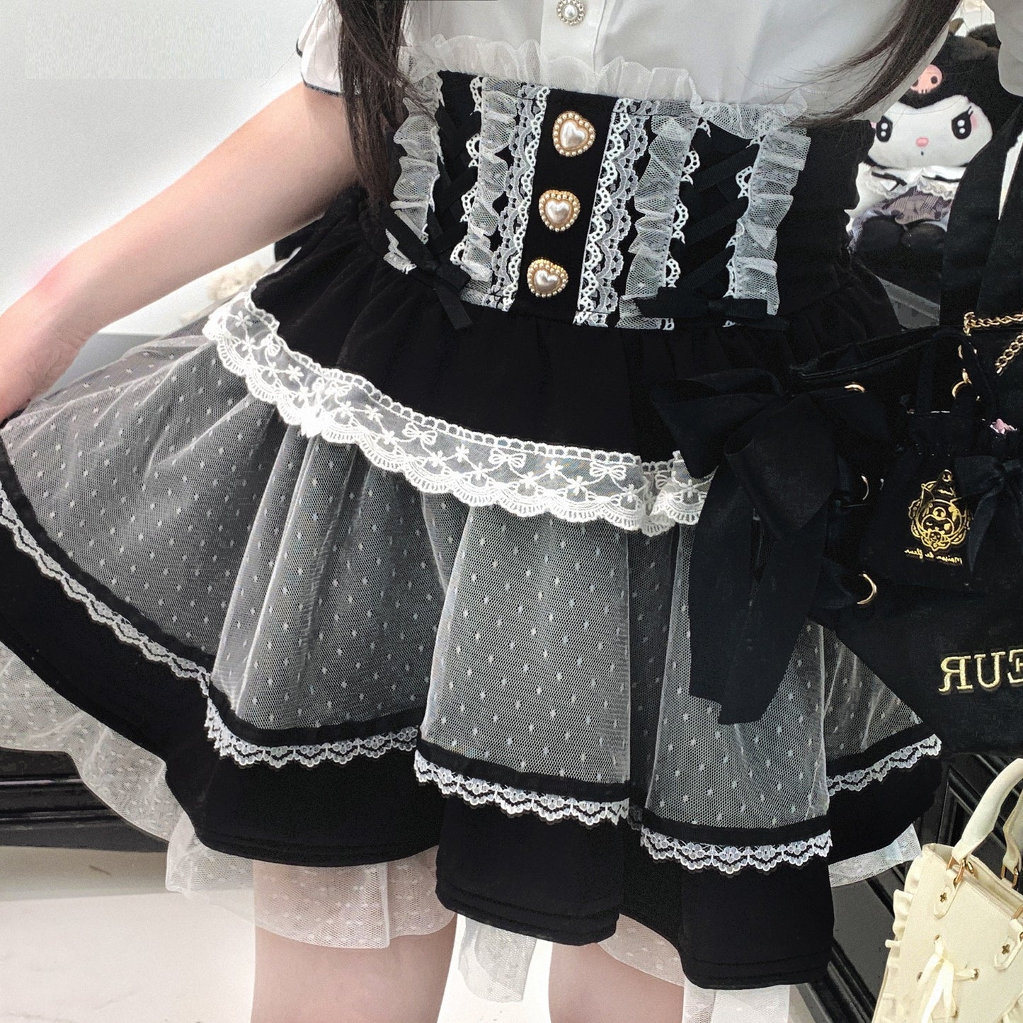 Style Keywords: Jirai Kei, tulle skirt, heart buttons, layered skirt, fairycore