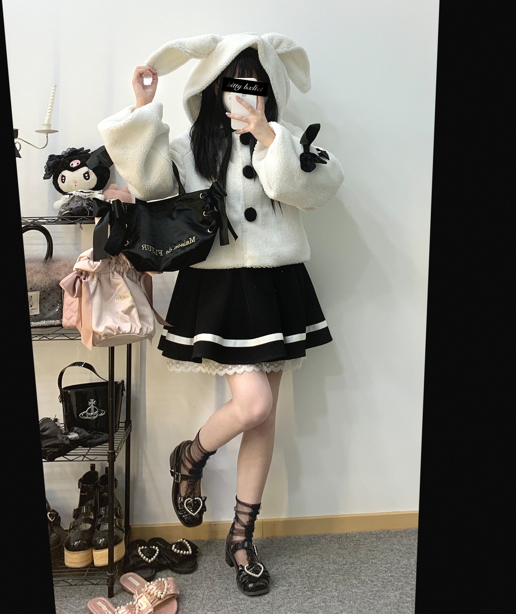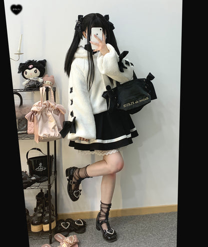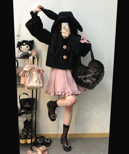Kitten Bullet Wanted Rabbit Plush Rabbit Ear Button Lace-up Black & White Winter Jacket