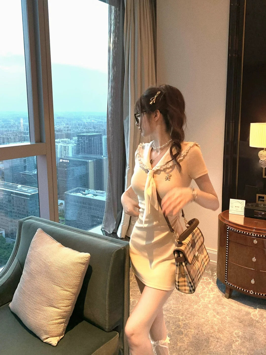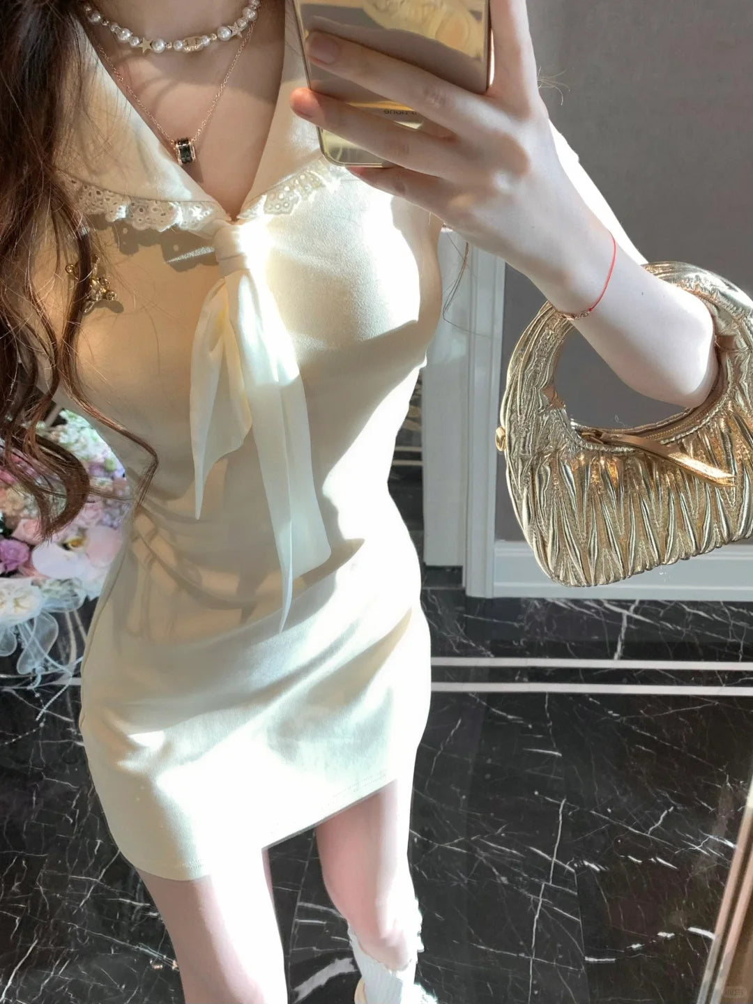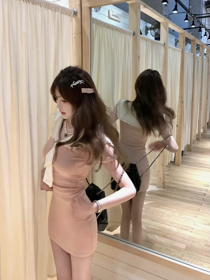 Lazy Girl Heartbeat Code Sailor Collar Pink Cream Bodycon Dress