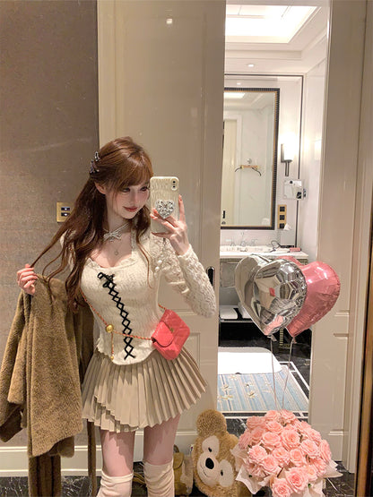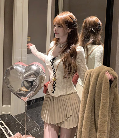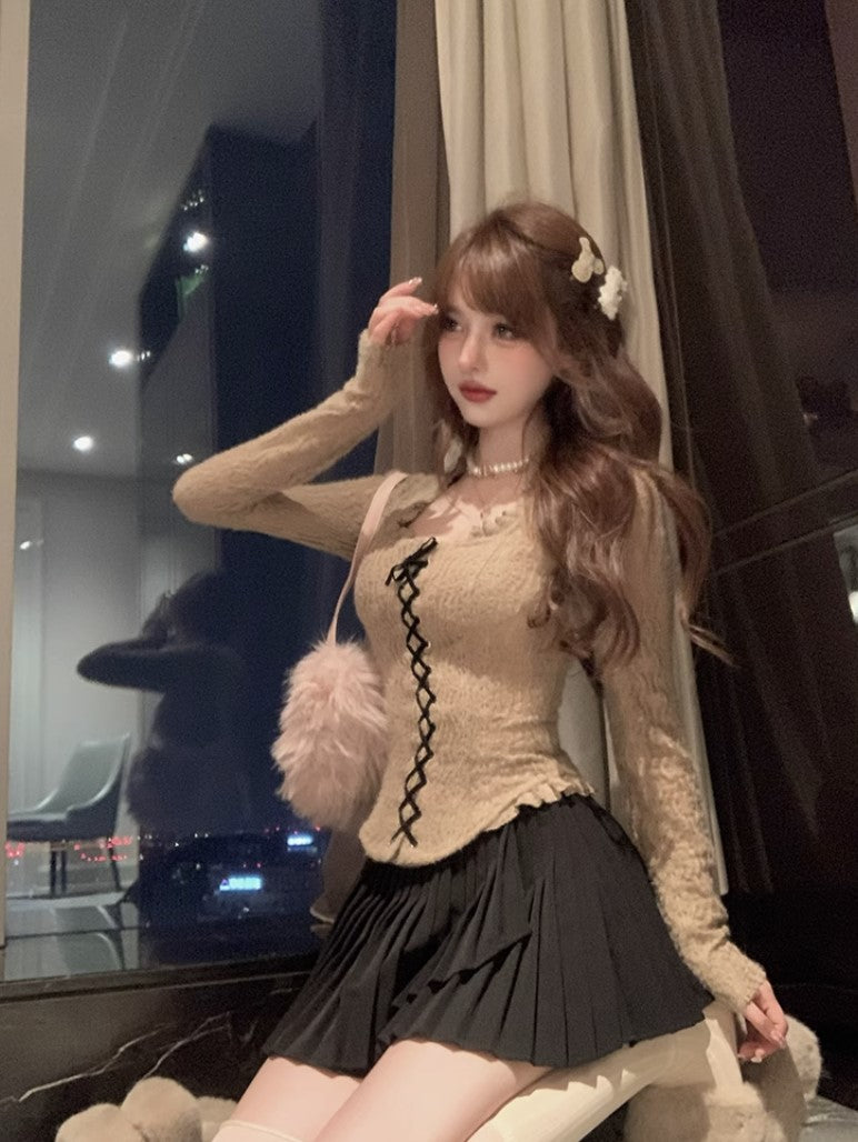 Lazy Girl Latte Suede Lace White Beige Brown Silm Fit Shirt Top