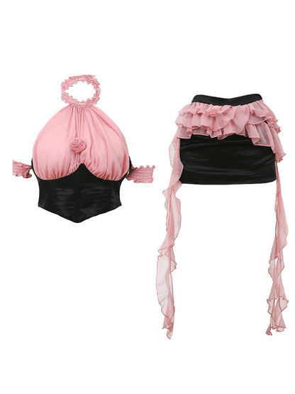 Lucia Hot Pink Lace Rose Black Halter Neck Top & Skirt Two Piece Set