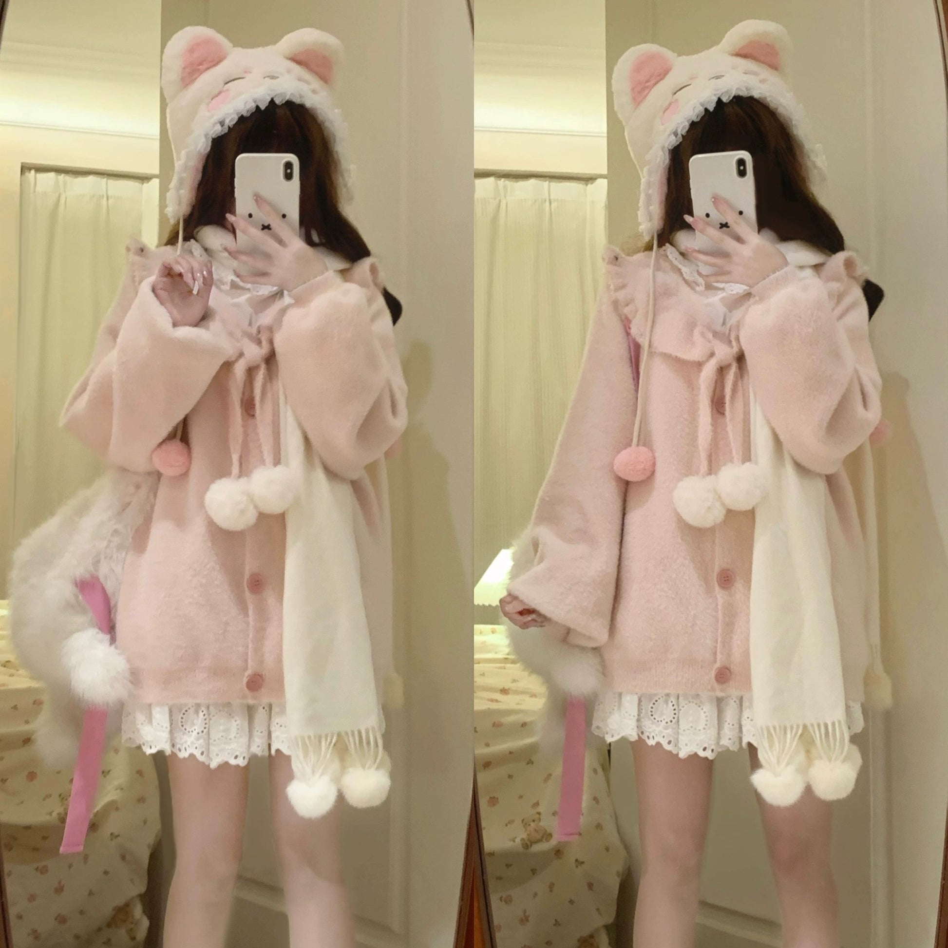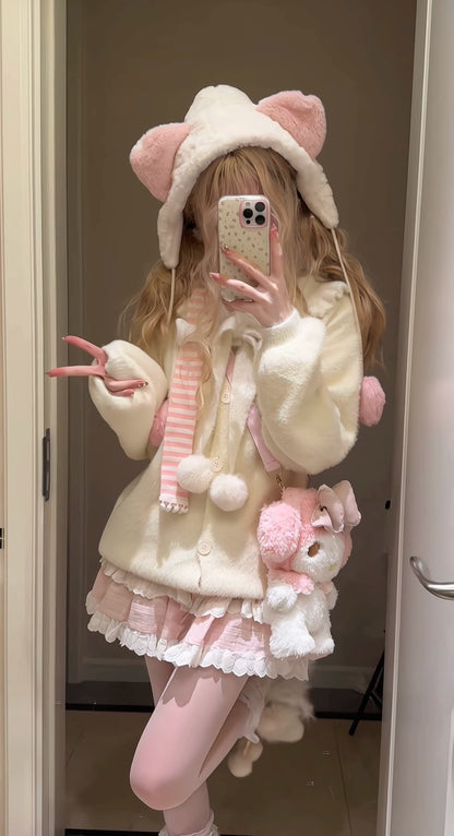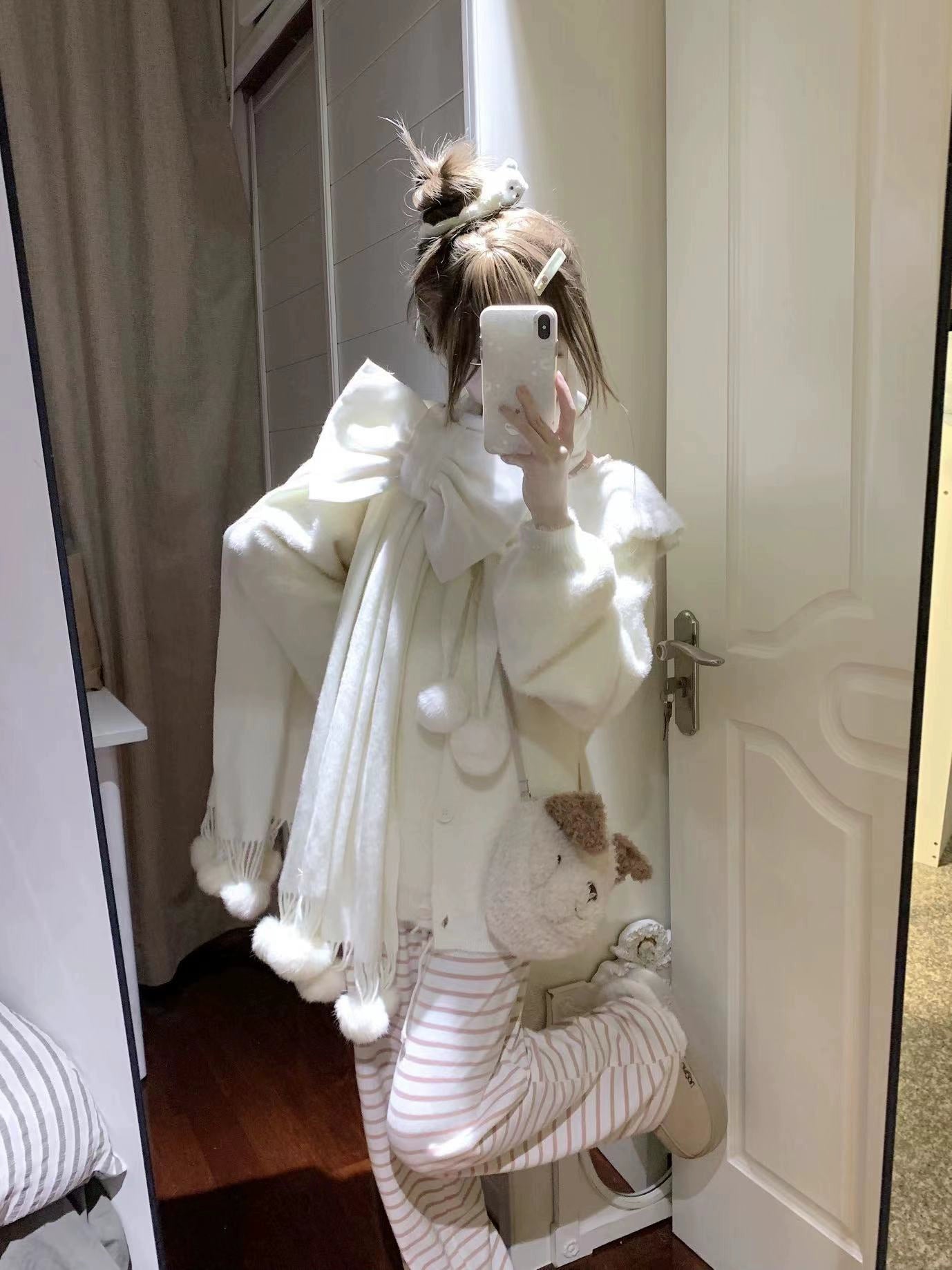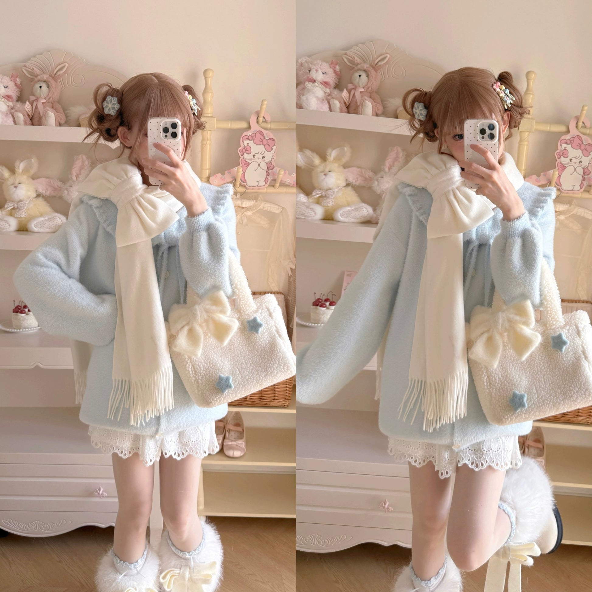 Luyu Soft White Pink Blue Knit Sweater & Skirt & Scarf Three Piece Set