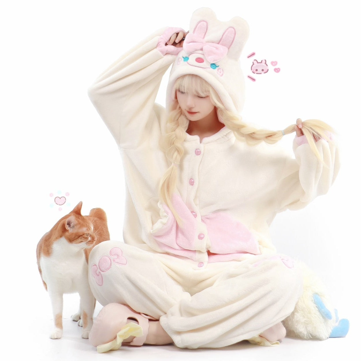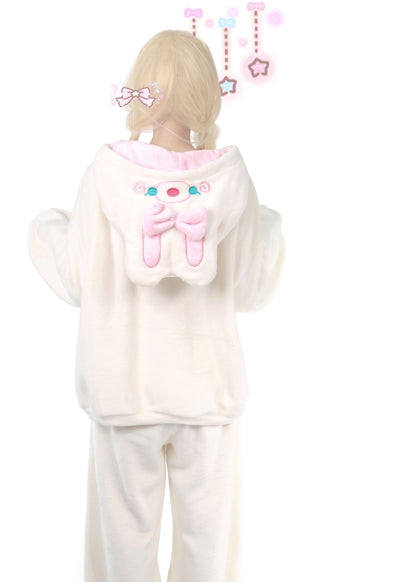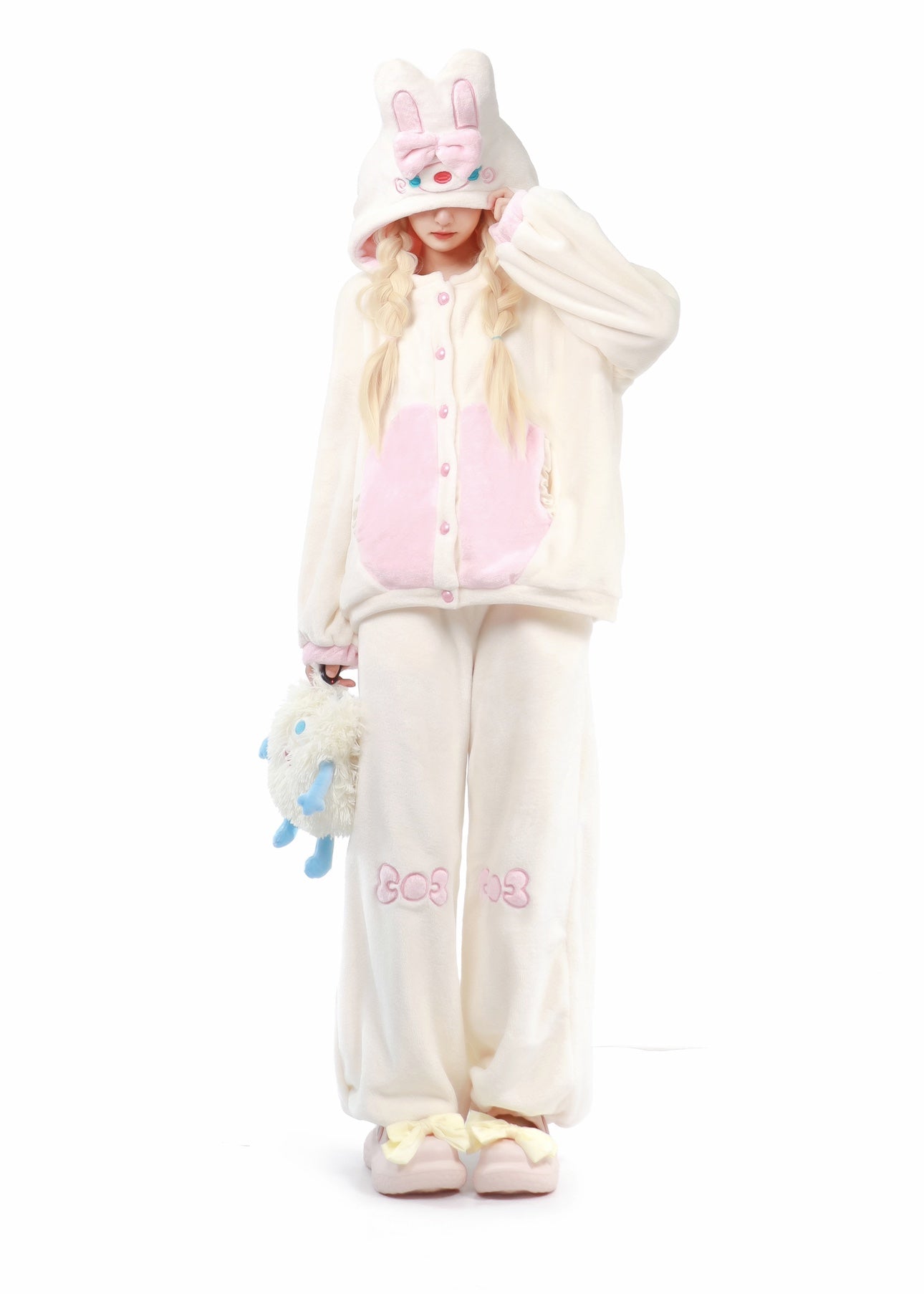 Maiden Park Rabbit Ears White Brown Coral Fleece Winter Pajamas Hooded Tops & Pants Two Piece