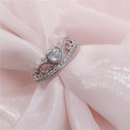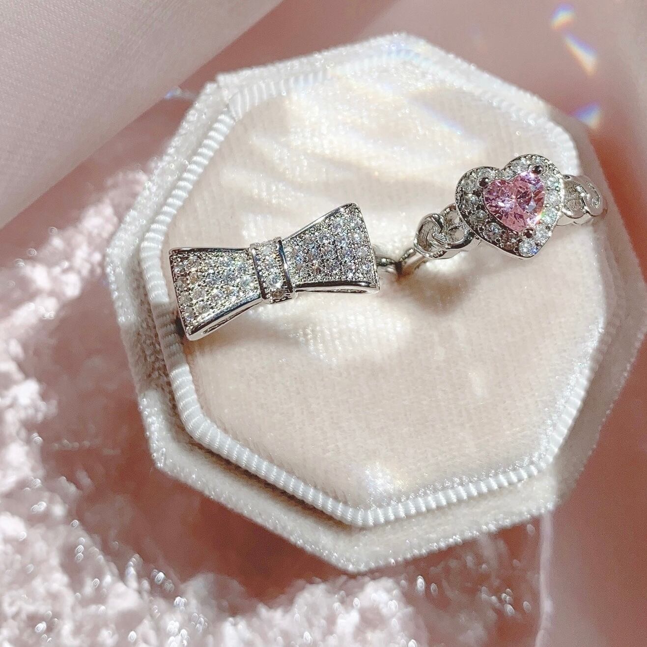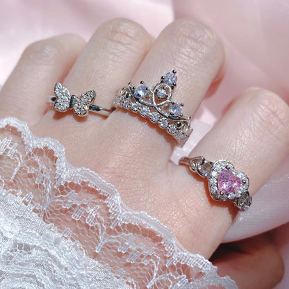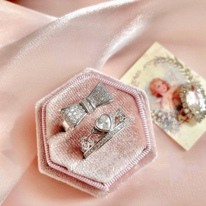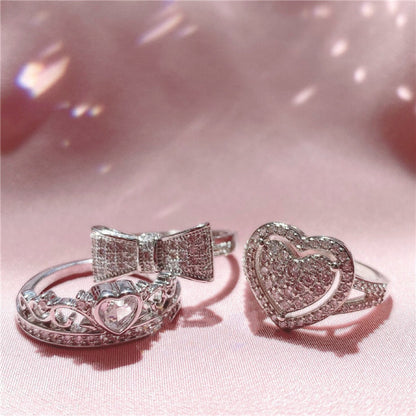 Pink Silver Love Bow Rhinestone Diamond Crown Ring Collection Set Accessories Jewerly