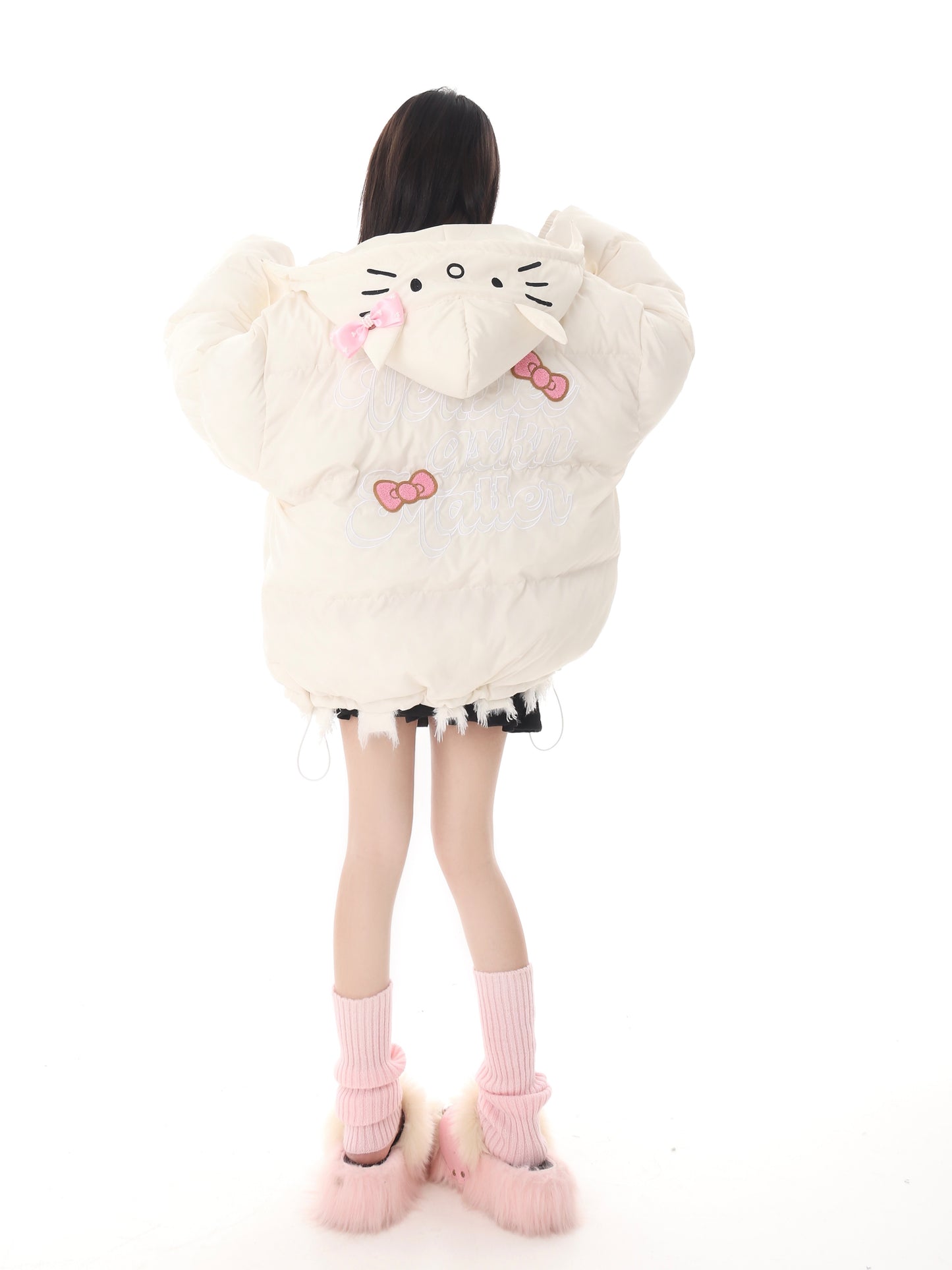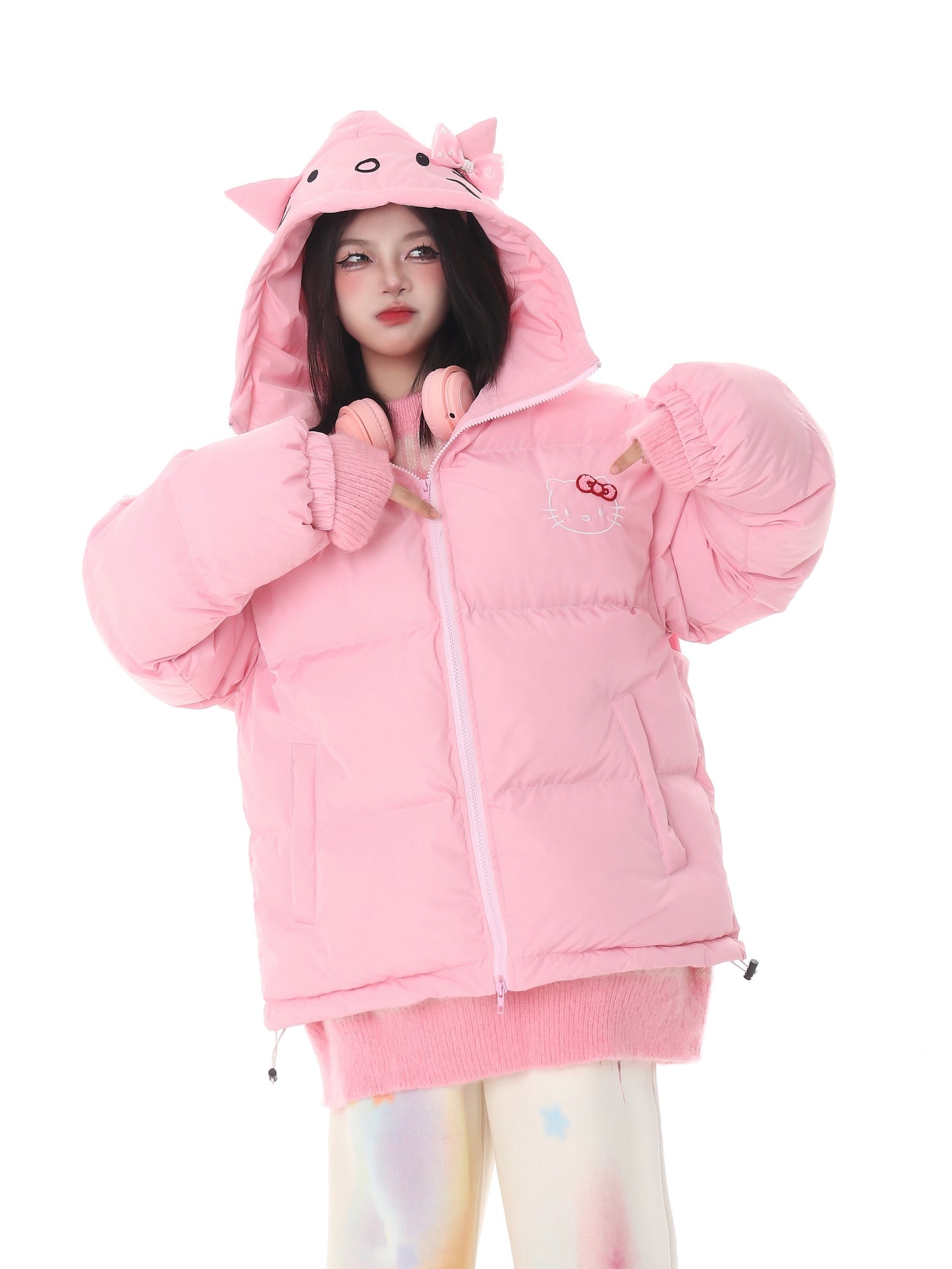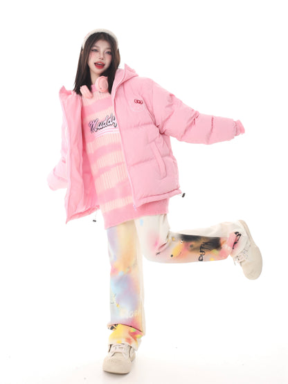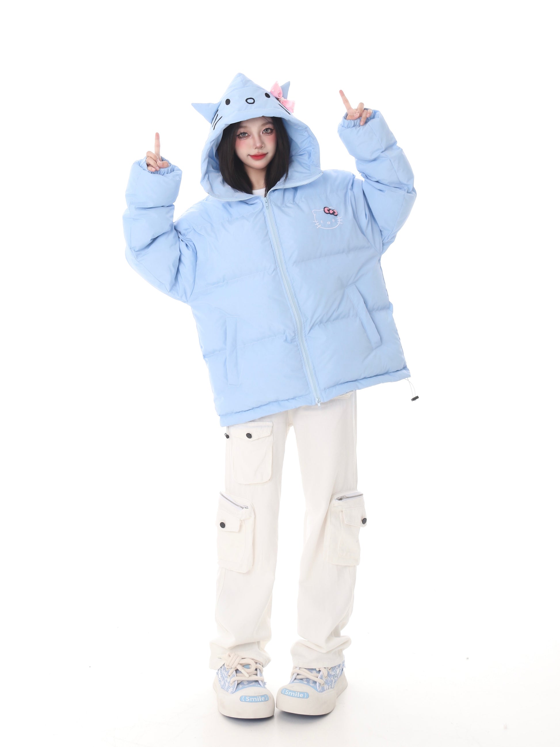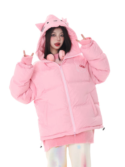 Pink White Blue Cartoon Kitty Cat Winter Thick Padded Puffer Jacket