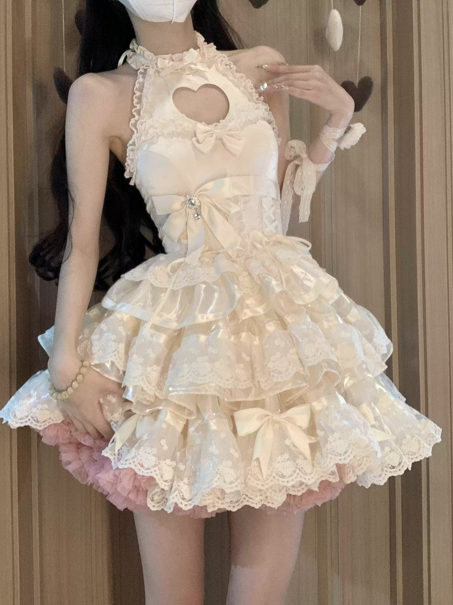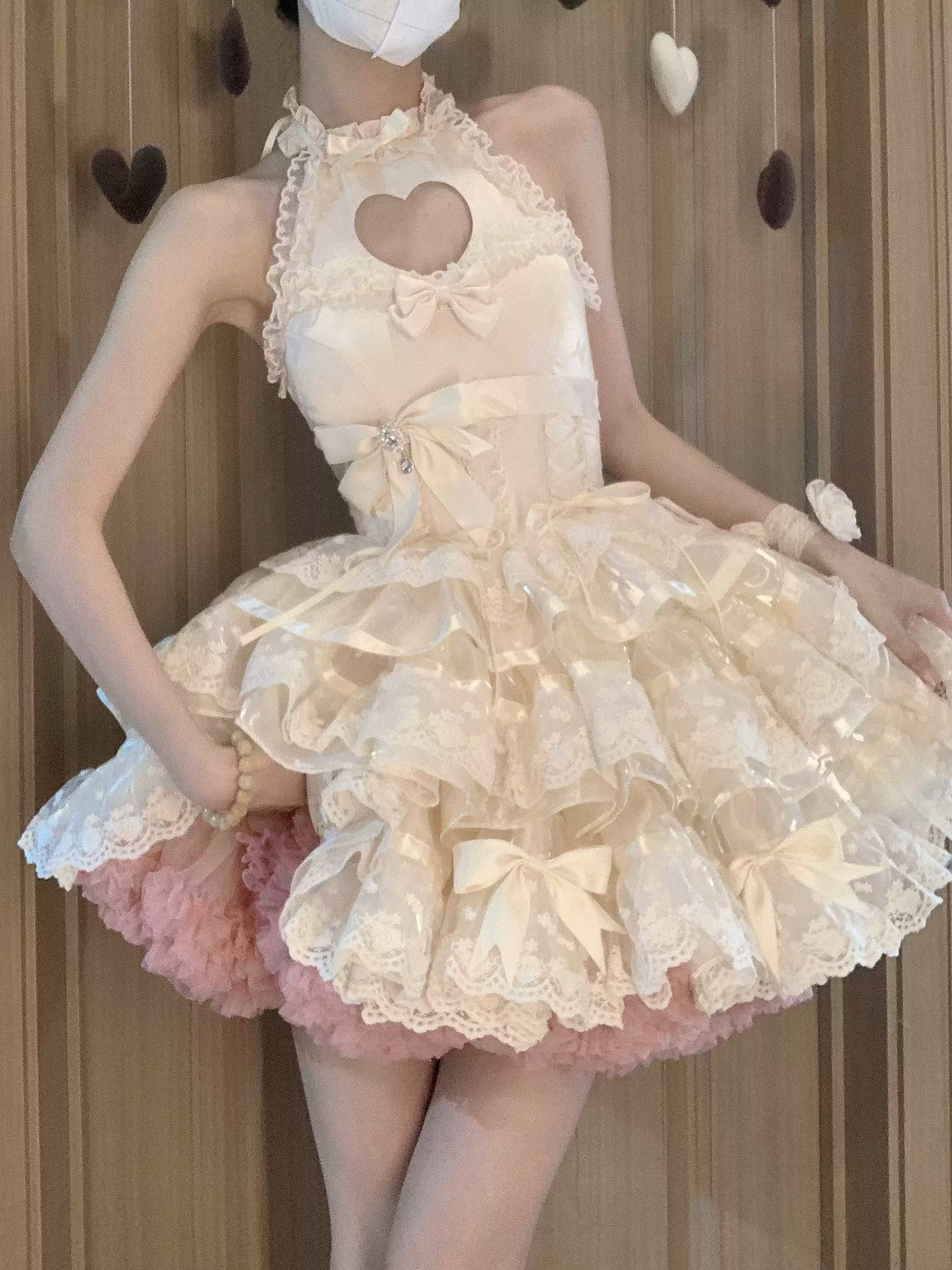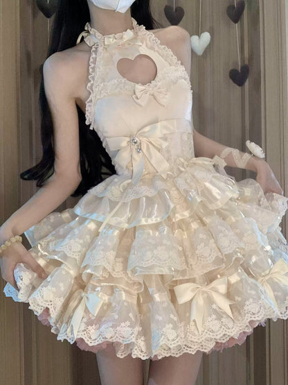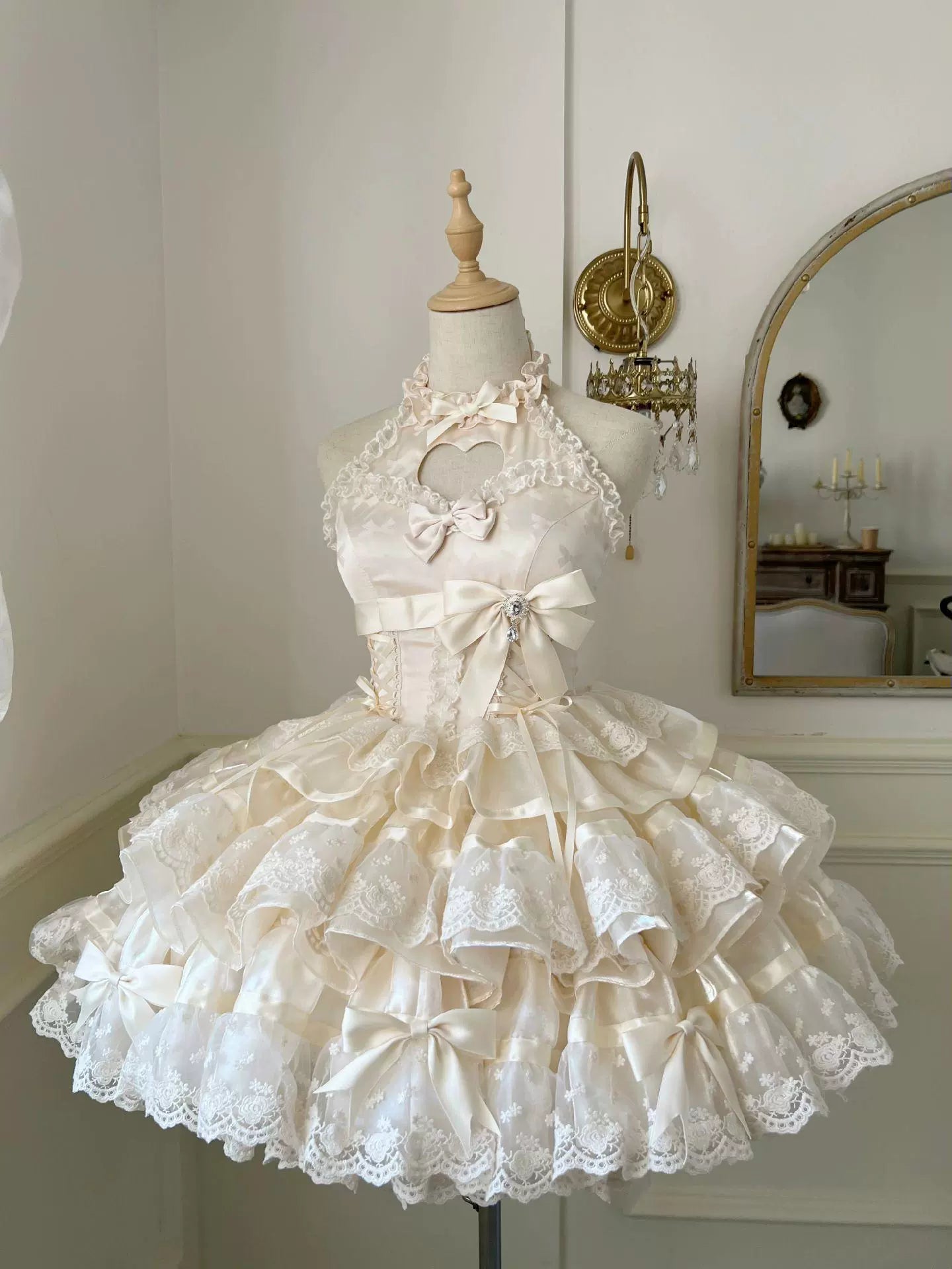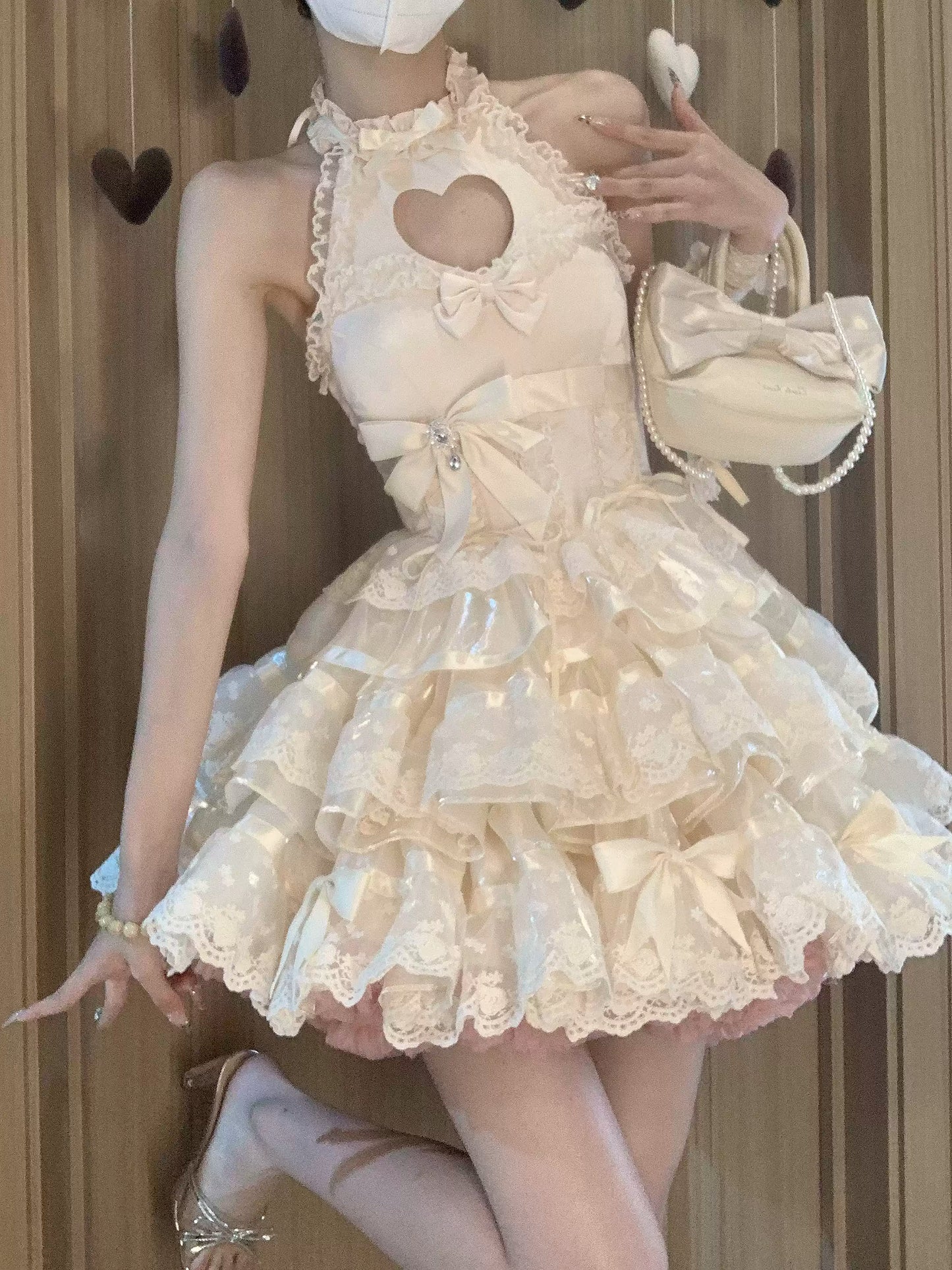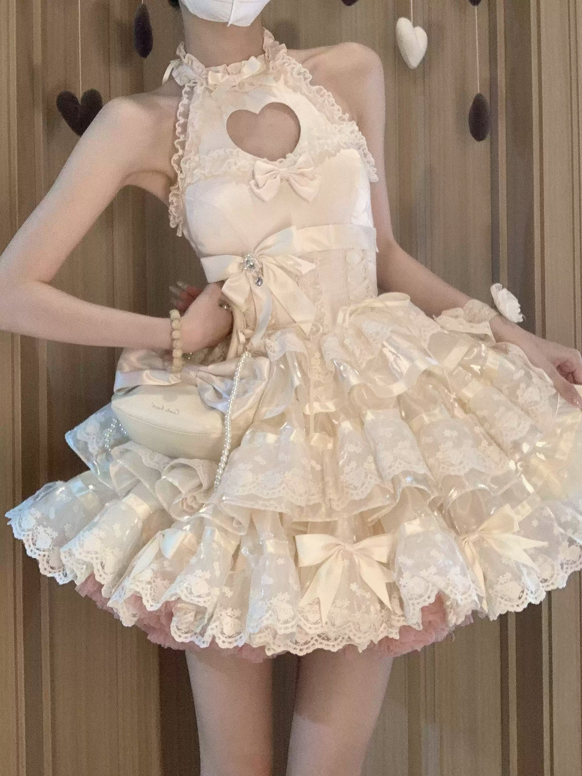 Indulge in the elegance and charm of our Girls Heart Pounding Cream Lolita Dress. Its hollow heart design below the neck will make you feel like a true princess, radiating beauty and grace. Perfect for any special occasion.