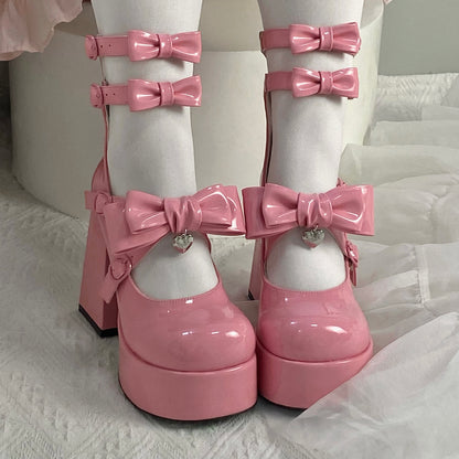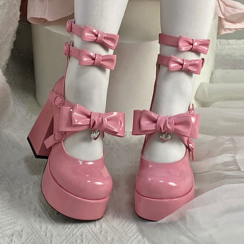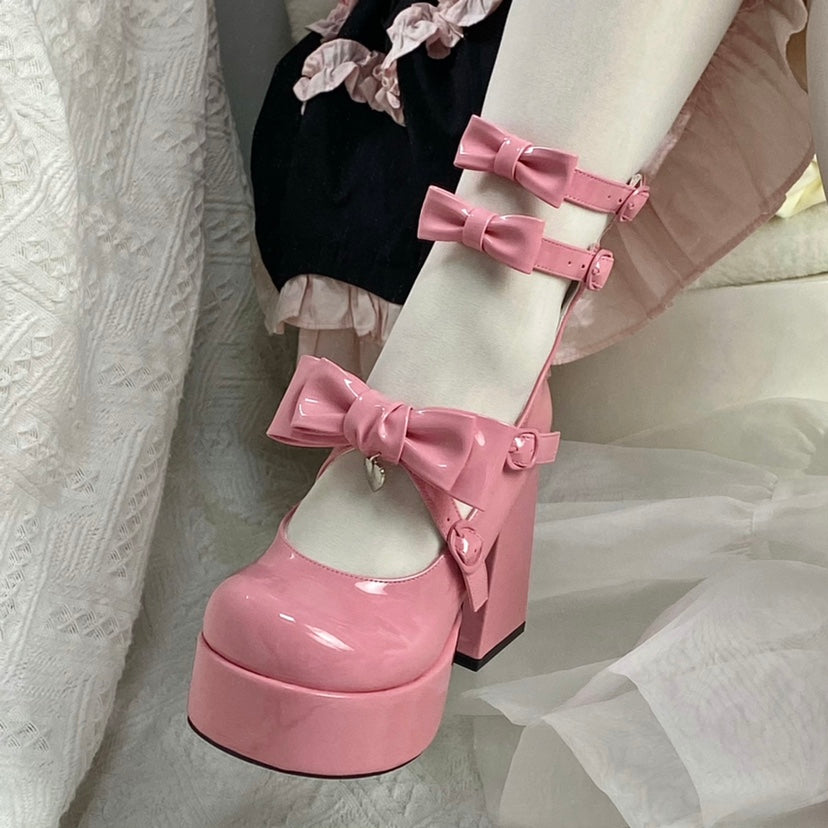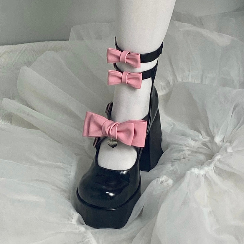 Pocket Cat Lolita Black Pink White Bow High Heels Shoes