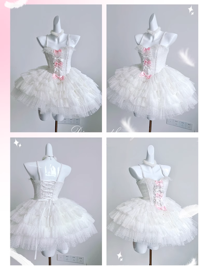 Diamond Sweetheart Pure White Swan Angel Pink Bow Coquette Princess Tulle Balletcore Strap Dress