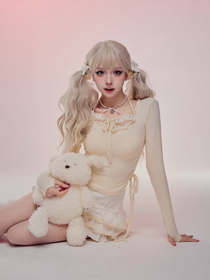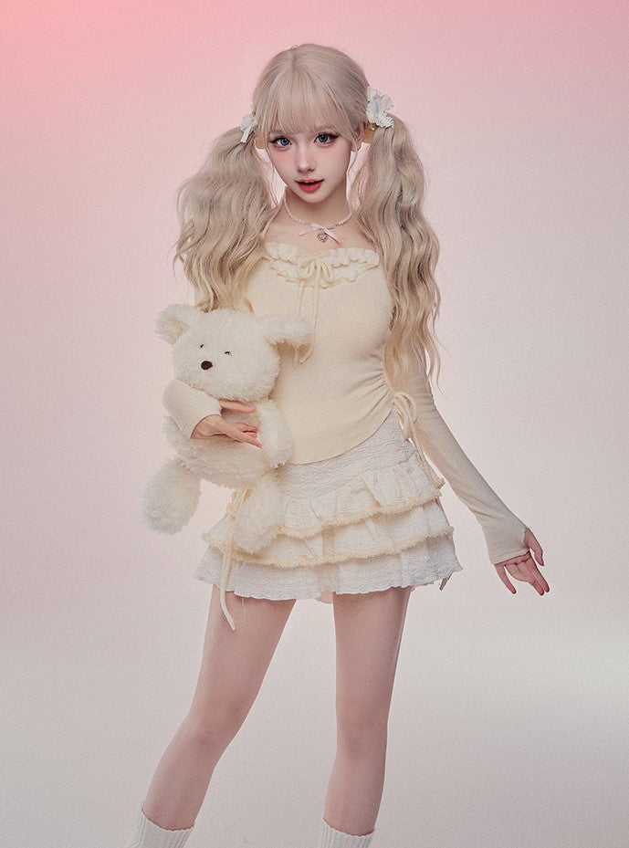 Serendipity Autumn Cute Yellow Pudding Shirt Top & Ruffled Mini Skirt Two Piece Set