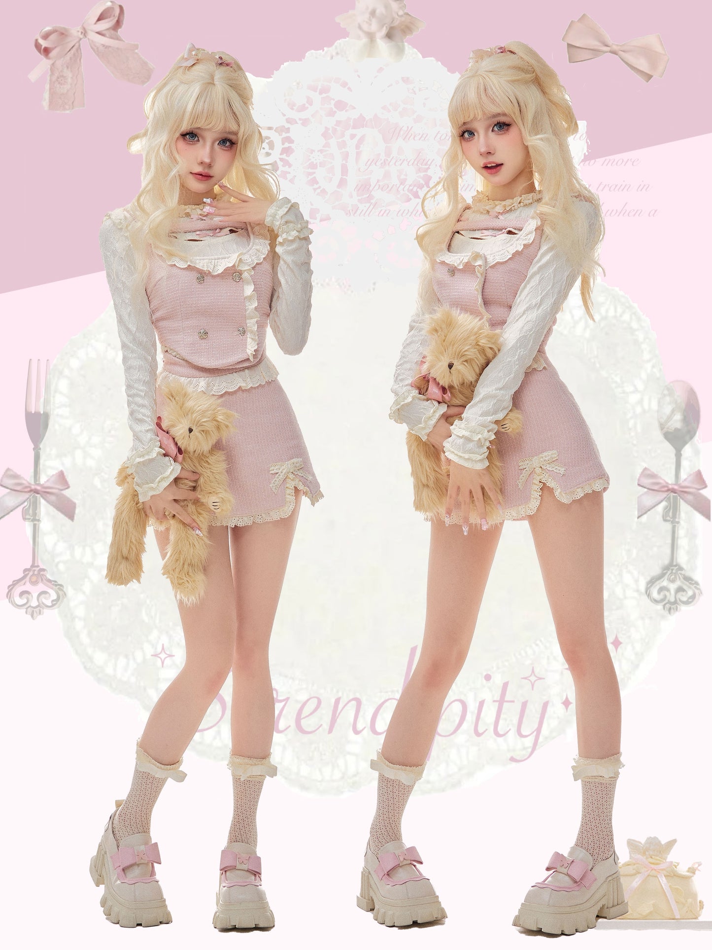 Serendipity Autumn Lady White Shirt Blouse & Tweed Pink Vest & Mini Skirt Three Piece Set