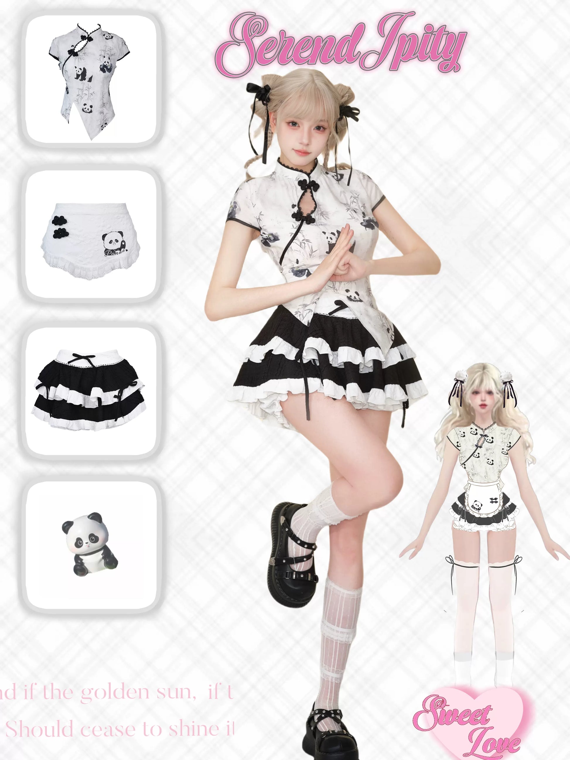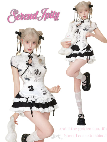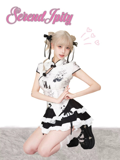 Serendipity Chinese Panda Black White Hanfu Top & Ruffle Skirt Apron Two Piece Set