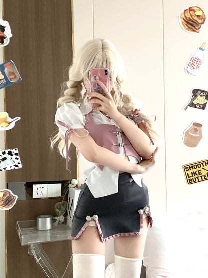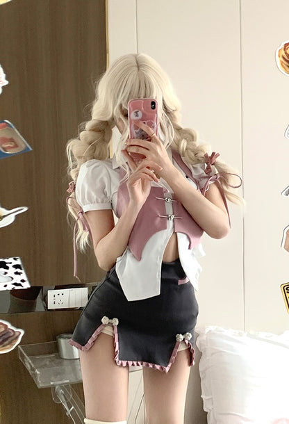 Serendipity Chinese Restaurant Waitress Pink Vest & White Shirt & Gray Mini Skirt Three Piece Set