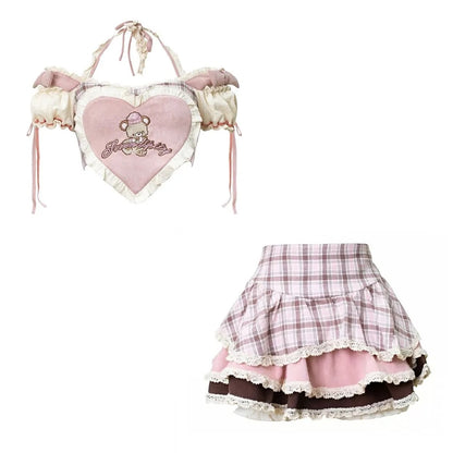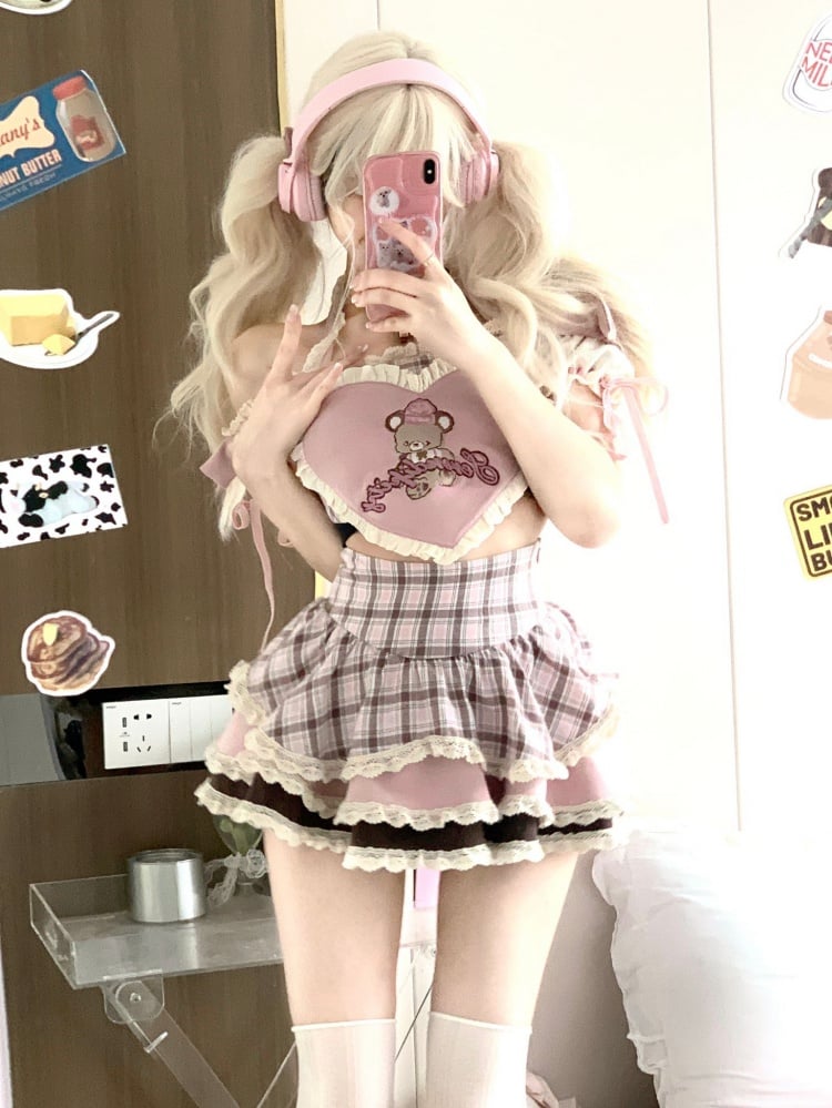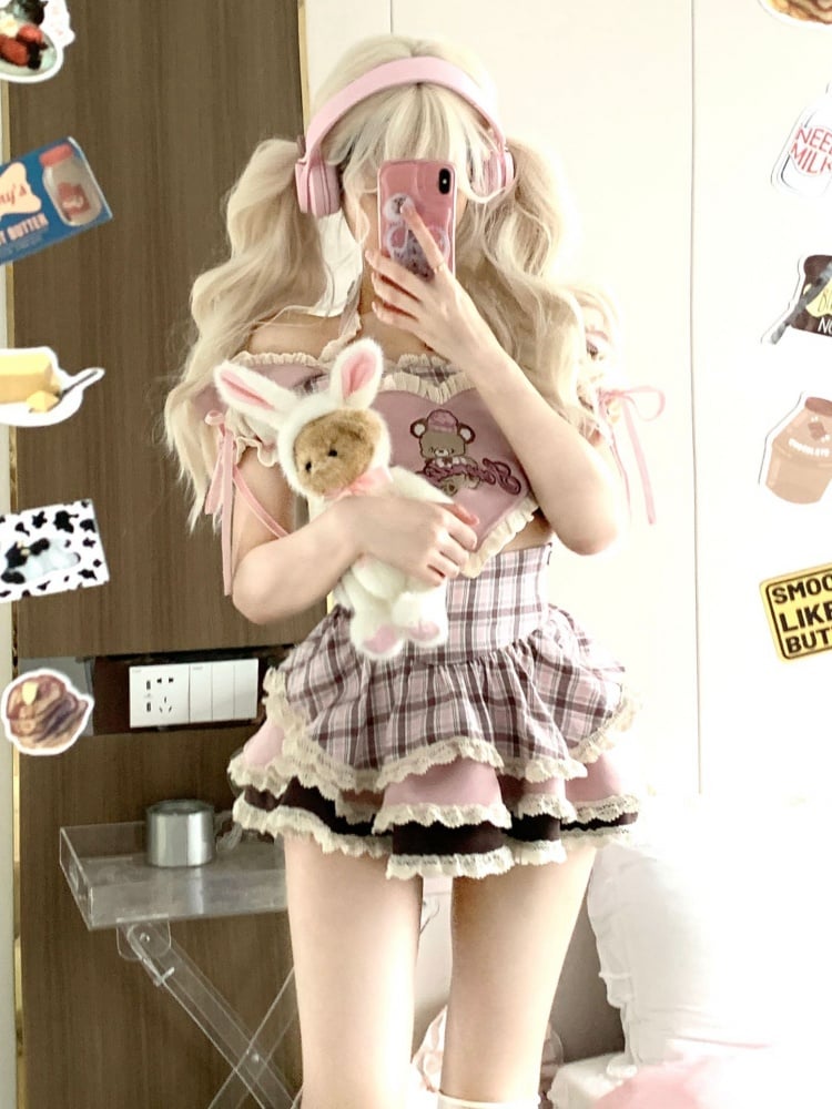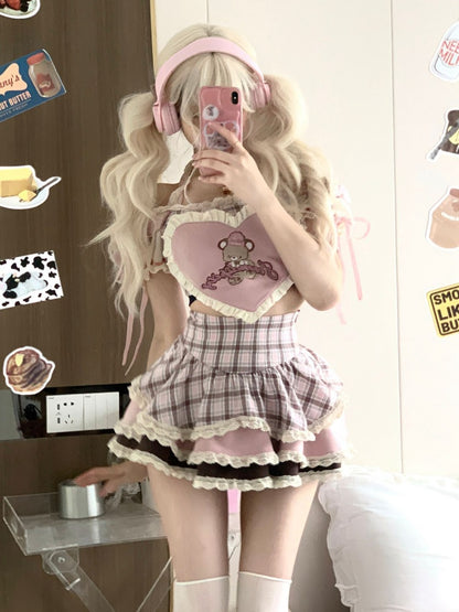 Serendipity Coquette Cute Teddy Bear Three Colors Pink Brown Camisole Top & Plaid Mini Skirt Maid Two Piece Set