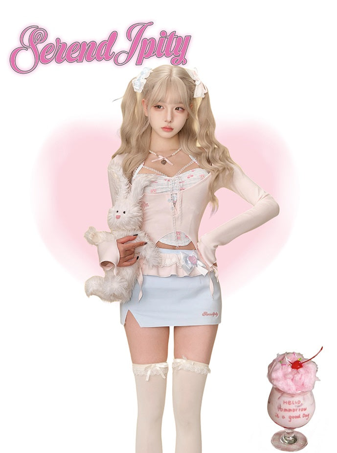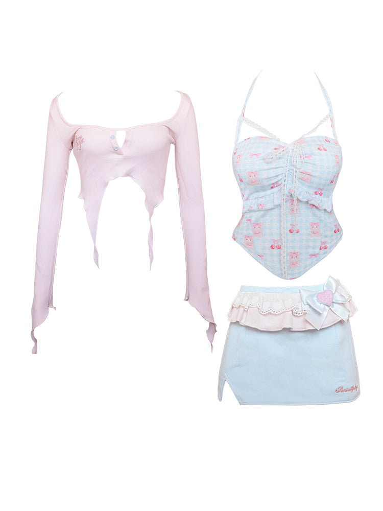Serendipity Dessert Series Candy Doll Blue Cami & Skirt & Pink Cardigan Three Piece Set