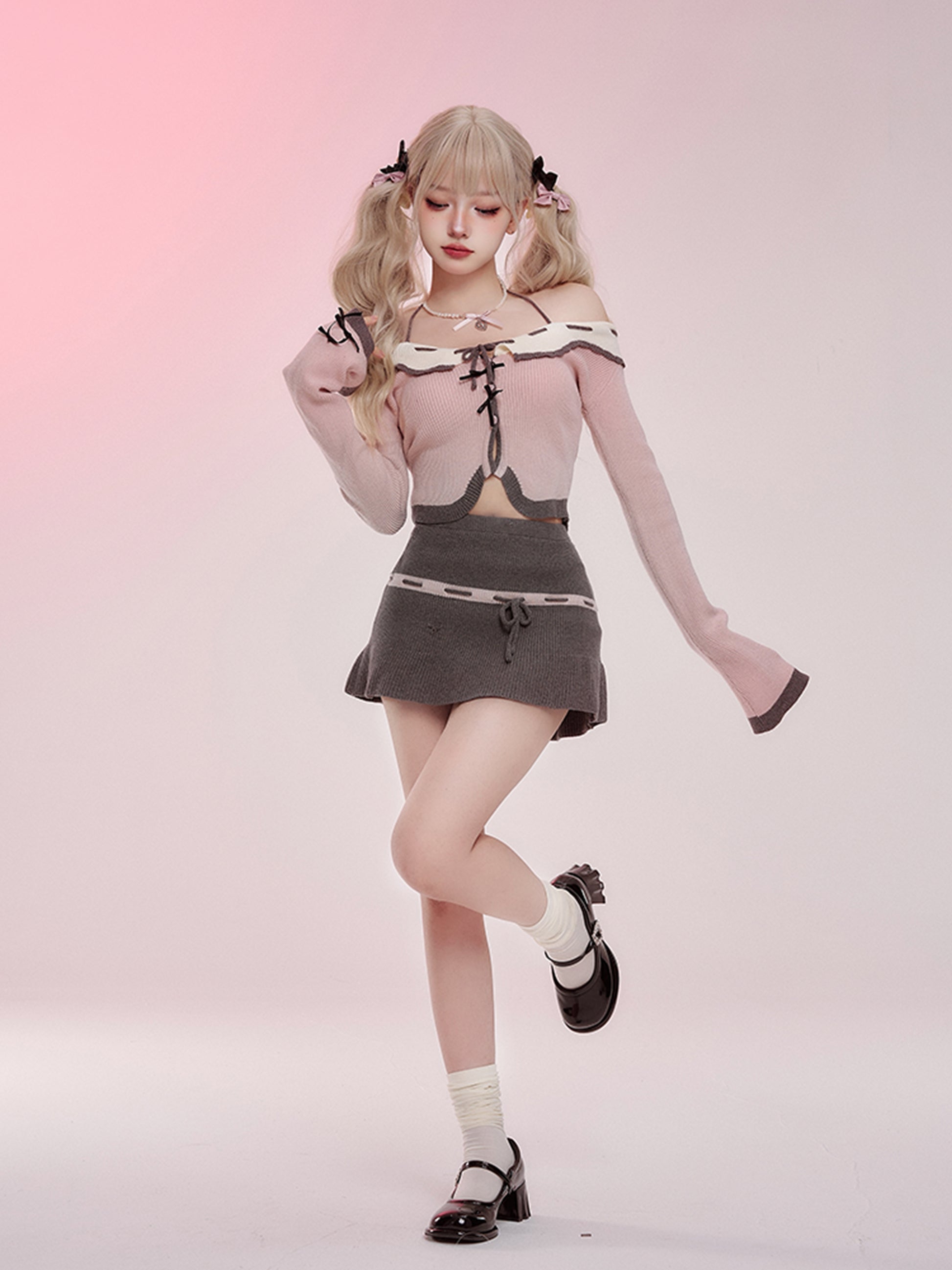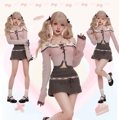 Serendipity Fall Mist Poetry Knit Pink Off Shoulder Sweater & Gray Skirt Two Piece Set