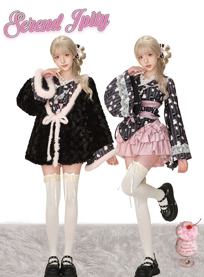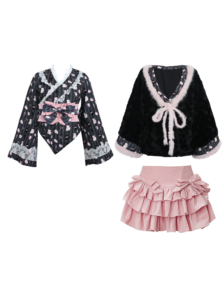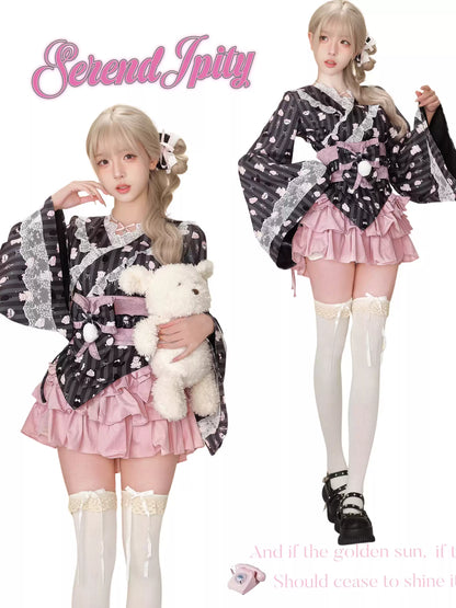 Serendipity Fireworks Song Kimono Black Top & Jacket & Pink Skirt Three Piece Set