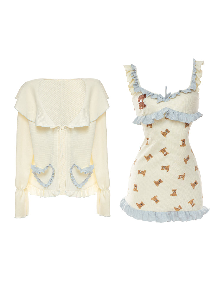 Serendipity Good Night Teddy Bear Cream Blue Strap Dress & Cardigan Pajamas Two Piece Set