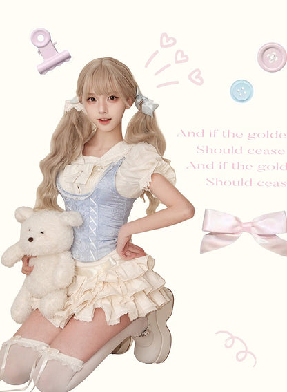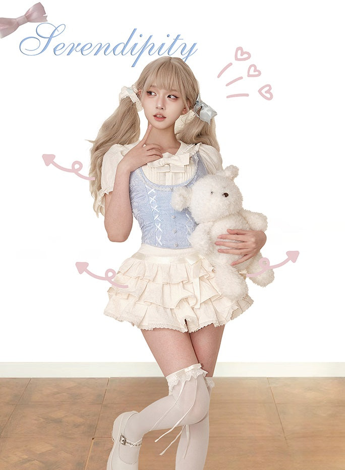 Serendipity Graven College Lace White Shirt & Blue Vest & Ruffle Skirt Three Piece Set
