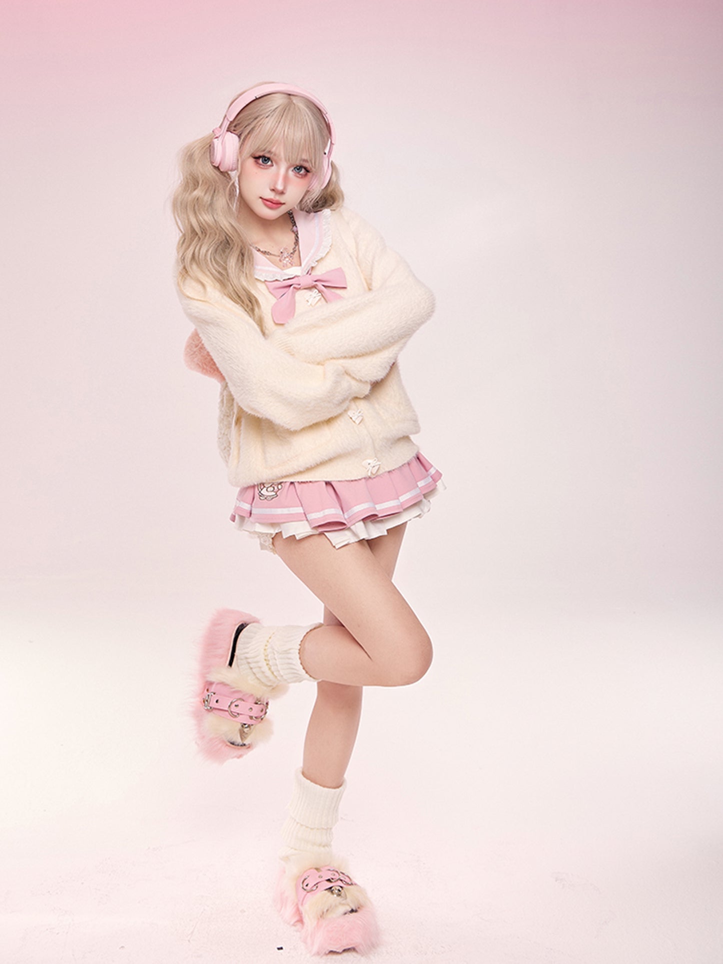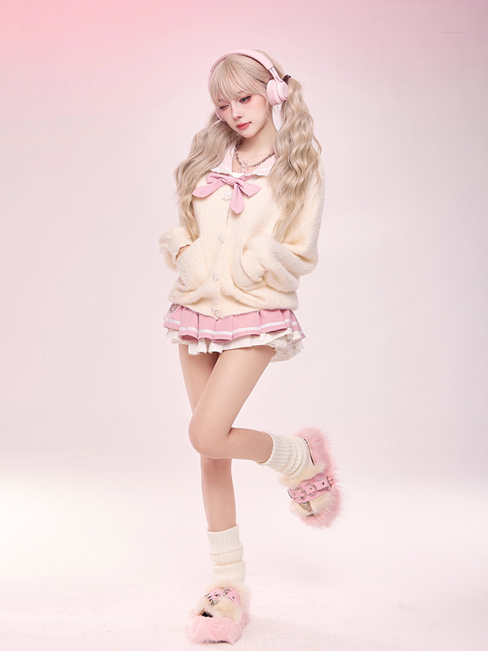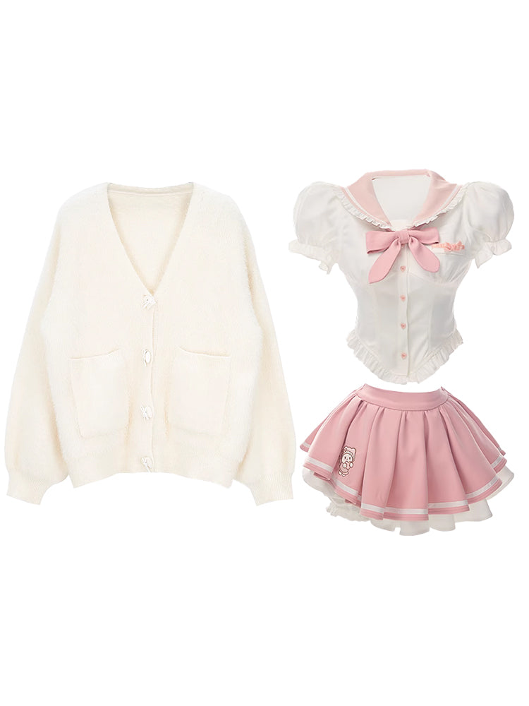 Serendipity Sweet Autumn Pink Bow Sailor Collar Seifuku Shirt & Pleated Skirt & White Cardigan Three Piece Set