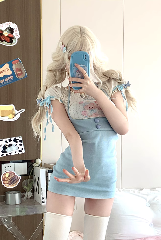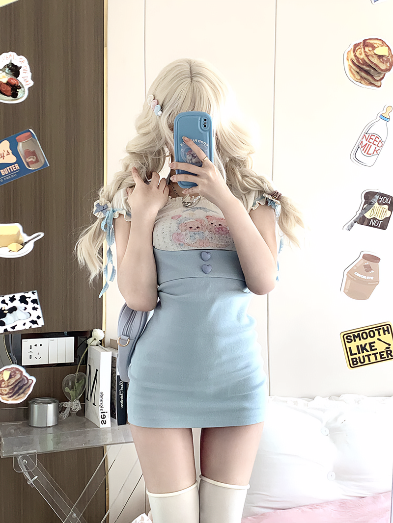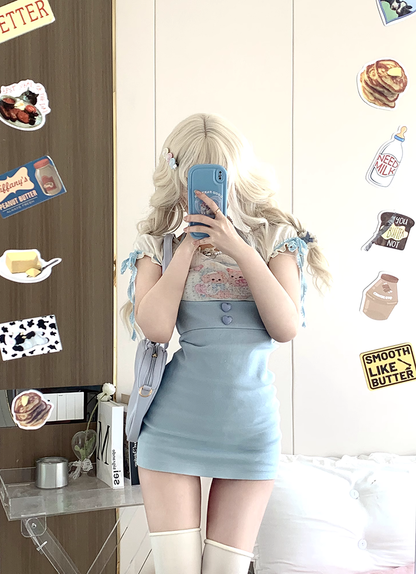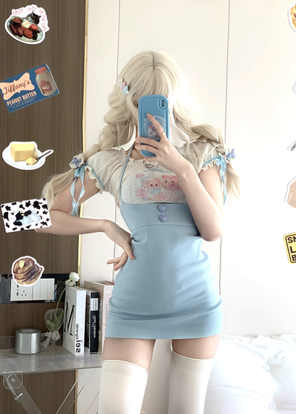 Serendipity Sweet Bear White Shirt Blouse Top & Blue Suspender Skirt Two Piece Set