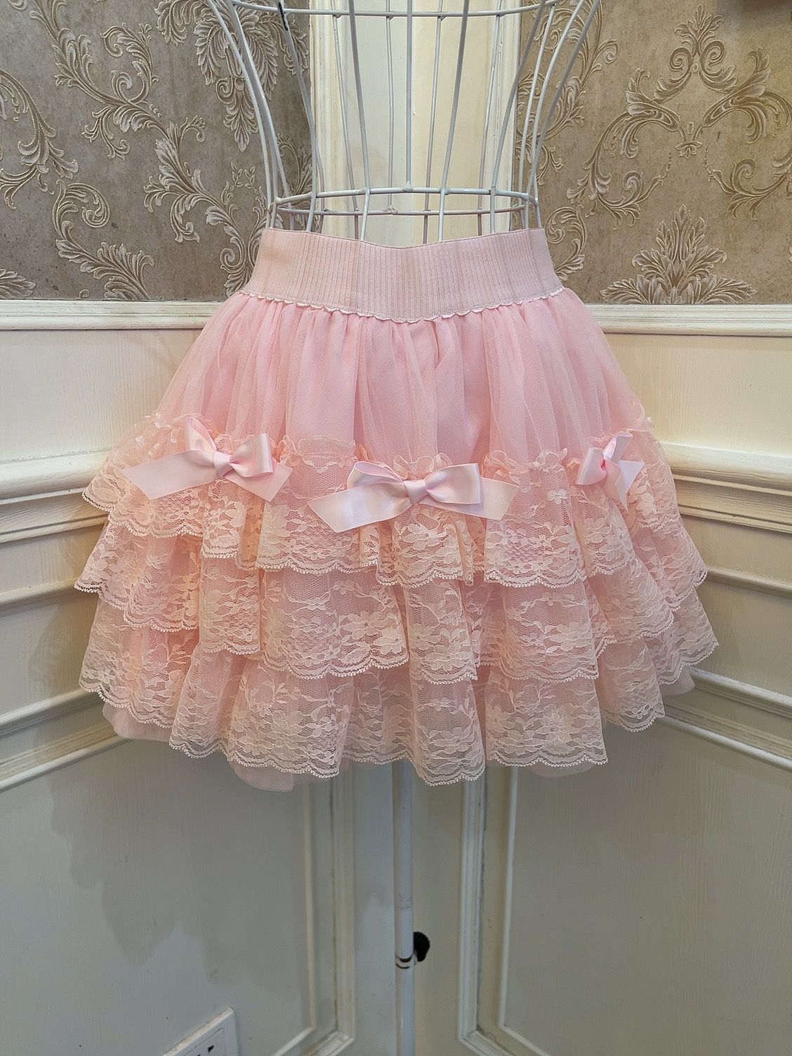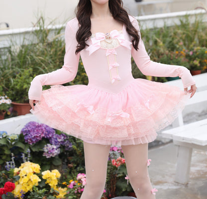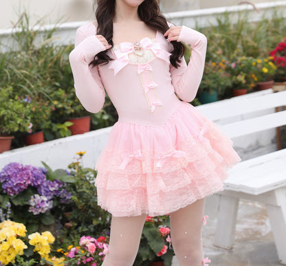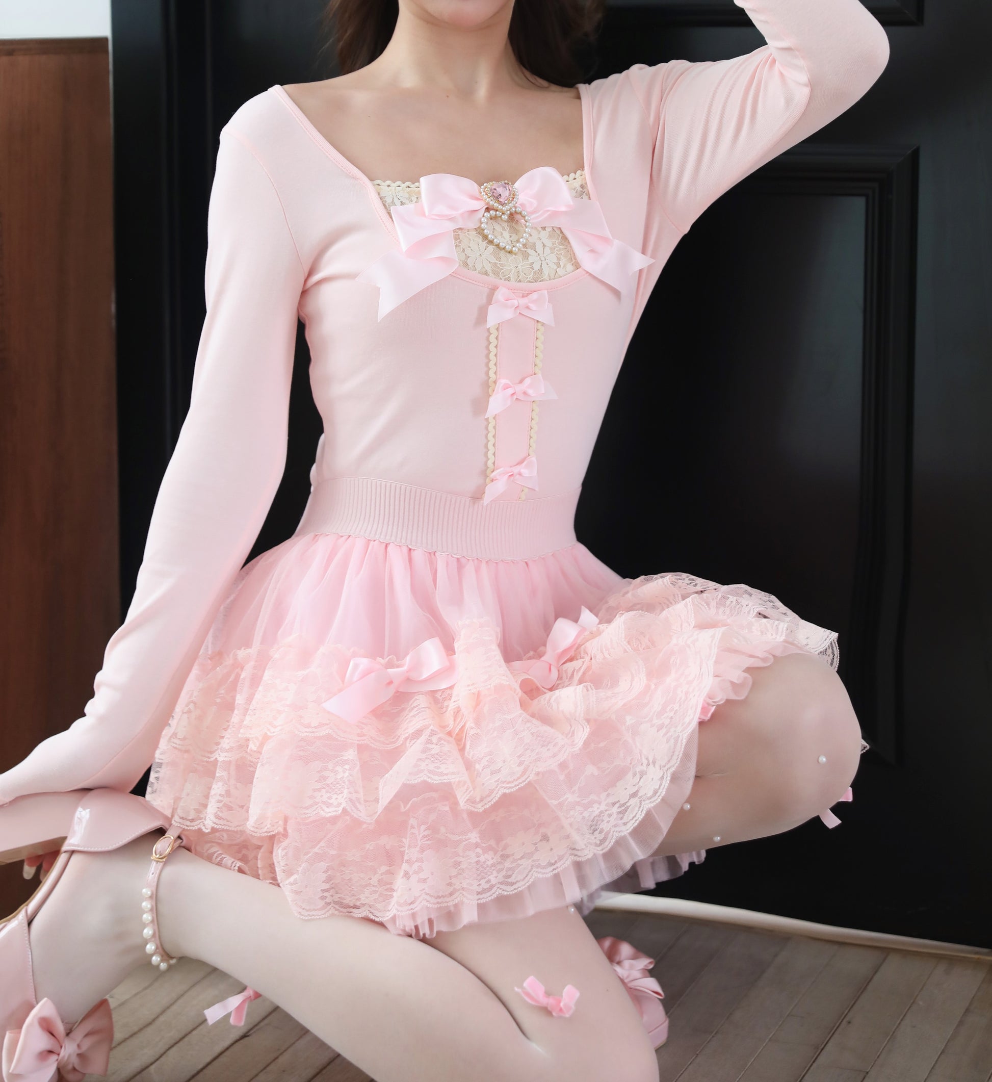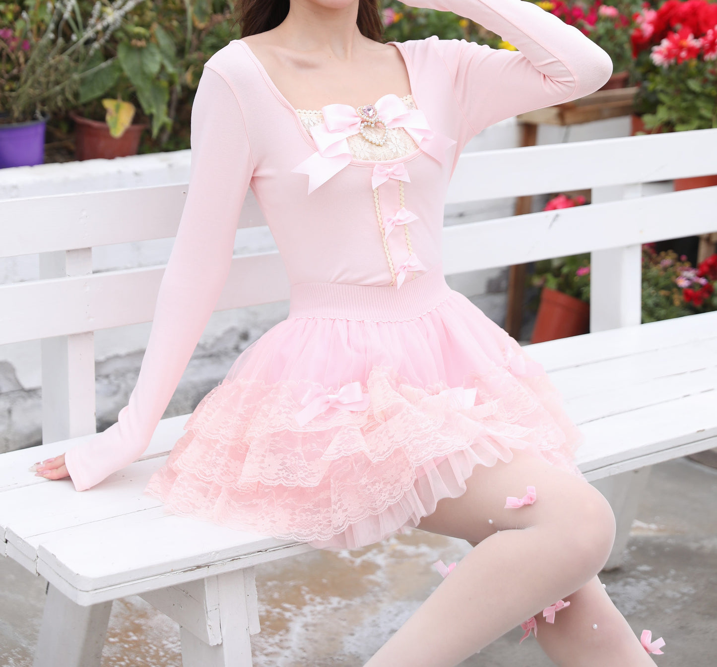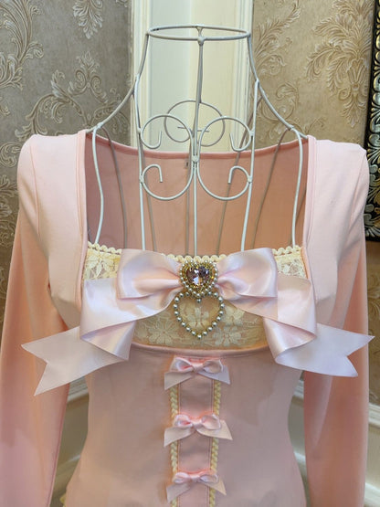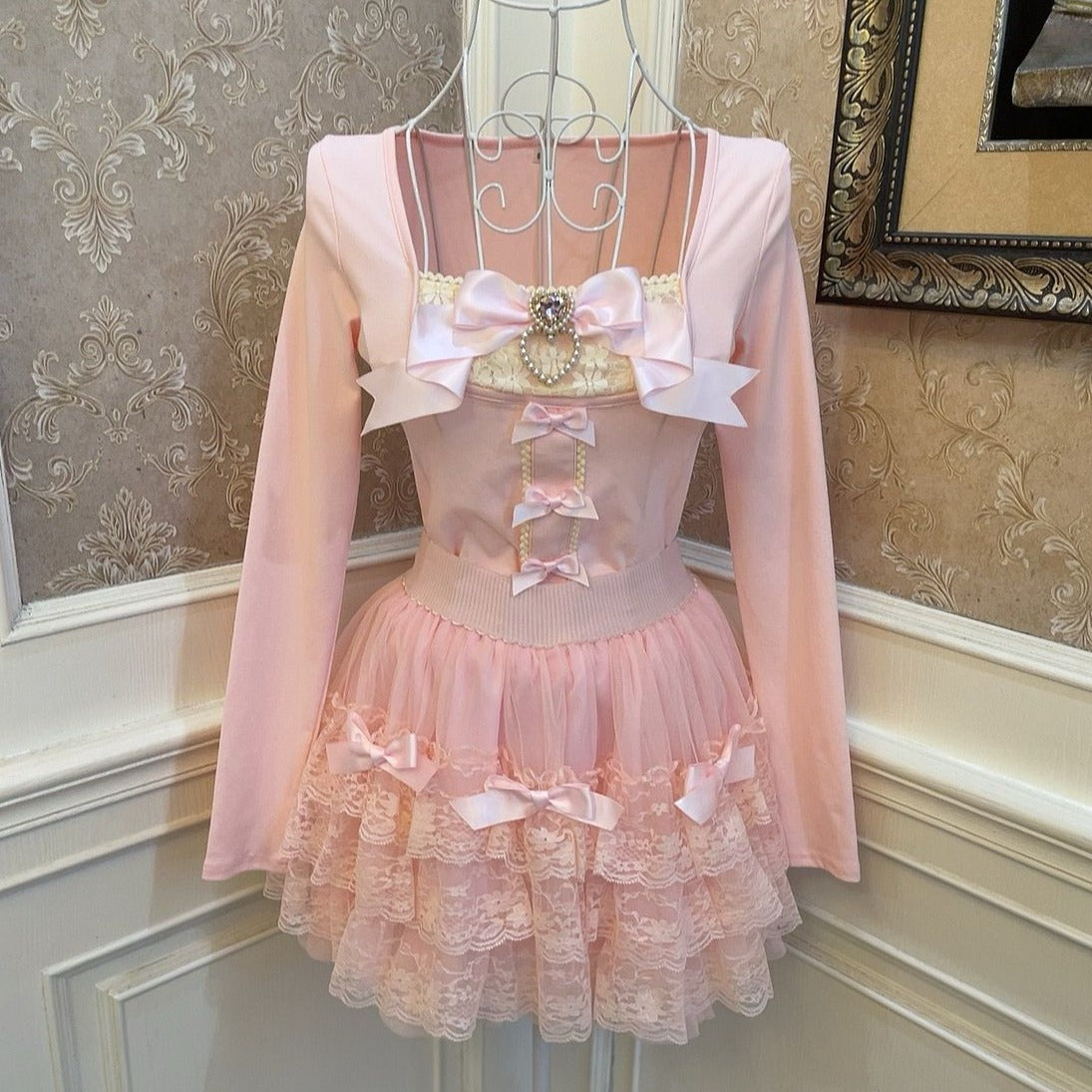 Sweetheart Princess Balletcore Pink Bow Lace Shirt Top & Skirt Two Piece Set
