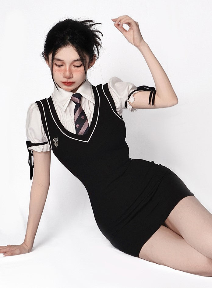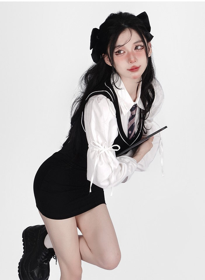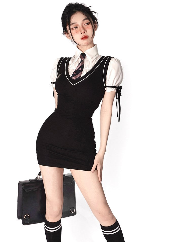 Young Eyes Preppy College School Girl Academia Black & White Shirt Dress Two Piece Set