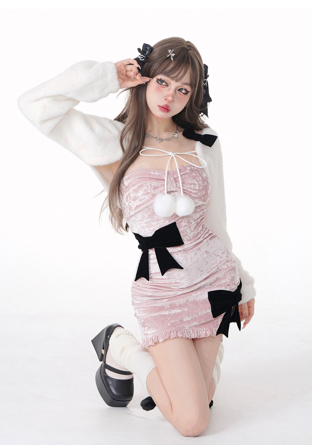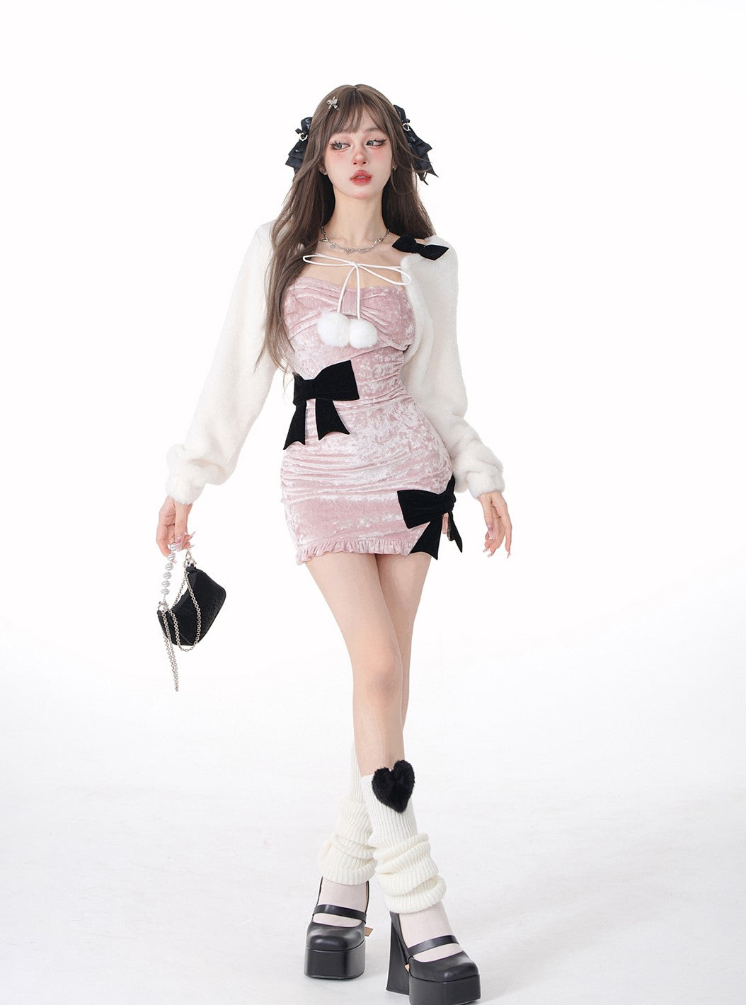 Young Eyes Sakura Memories Pink Velvet Black Bow Sexy Bodycon Dress