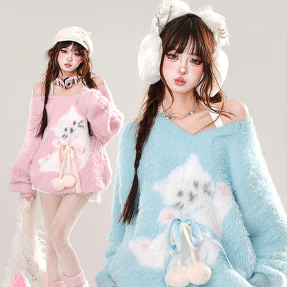 Young Eyes Sweet Pompom Cat Blue Pink Fuzzy Sweater