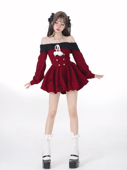 Young Eyes Winter Paris Holiday Red Wine Burgundy Off Shoulder Dress