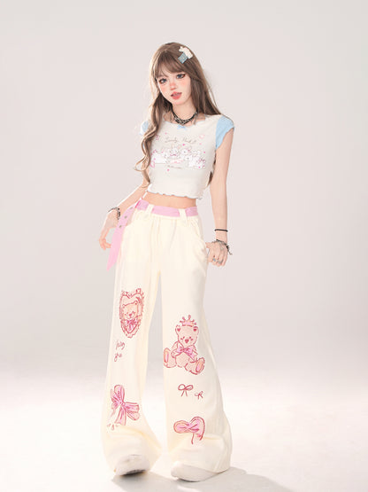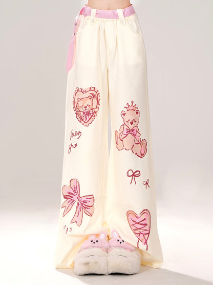 Young Eyes Y2K Cute Teddy Bear Print Cream & Pink Elastic Gathered Pants